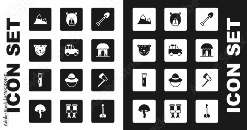 Set Shovel, Car, Tiger head, Mountains, African hut, Bear, Wooden axe and Flashlight icon. Vector