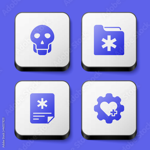 Set Skull, Medical health record folder, Patient and Heart with cross icon. White square button. Vector