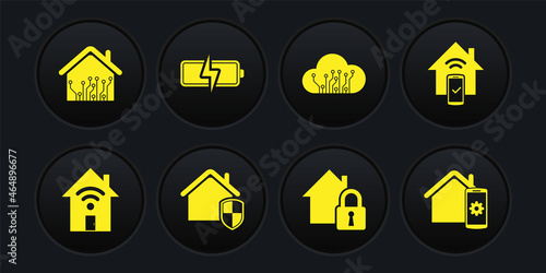 Set Smart home with wi-fi, remote control system, House under protection, Internet of things, Battery, and icon. Vector