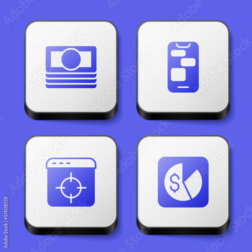 Set Stacks paper money cash, Mobile 24 hours support, Target financial goal and Market analysis icon. White square button. Vector