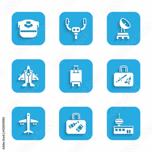 Set Suitcase, Airport control tower, Plane, Jet fighter, Radar and Pilot hat icon. Vector