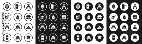 Set Taxi car, Car key with remote, Petrol or Gas station, Traffic light, call telephone service, Location the globe and icon. Vector