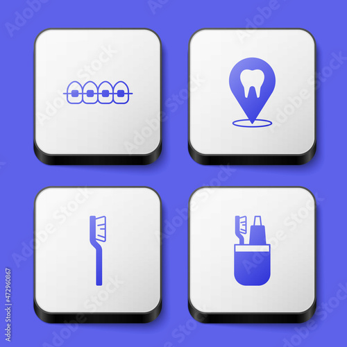 Set Teeth with braces, Dental clinic location, Toothbrush and and toothpaste icon. White square button. Vector