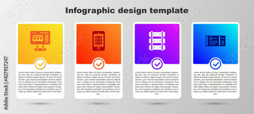 Set Ticket office to buy tickets, Buy train online, Railway, railroad track and Train. Business infographic template. Vector