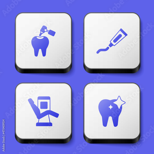 Set Tooth with caries and drill, Tube of toothpaste, Medical dental chair and whitening icon. White square button. Vector
