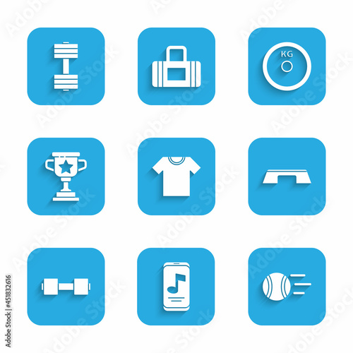 Set T-shirt, Music player, Tennis ball, Step platform, Dumbbell, Award cup, Weight plate and icon. Vector