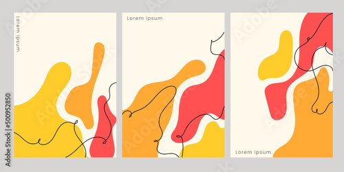 Set vector illustration of abstract liquid orange, yellow and red shape with curvy dark line, for wall decoration, flyer, banner, poster background