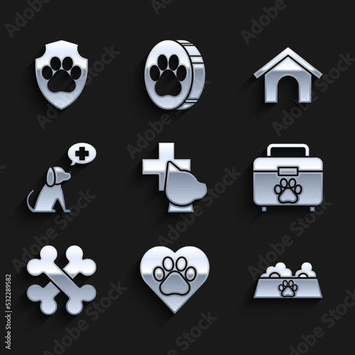 Set Veterinary clinic symbol, Heart with animals footprint, Pet food bowl for cat or dog, first aid kit, Crossed bones, Dog house and Animal health insurance icon. Vector