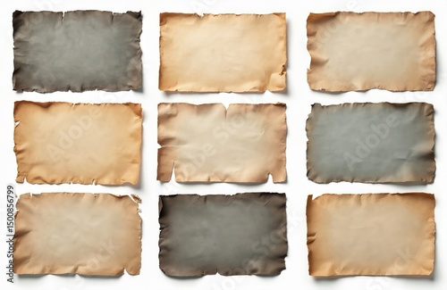 Set vintage paper sheets on white background. Old, aged, blank paper with rough, torn edges, scorched by fire. Grunge textured surface for letter design. Retro antique, weathered, stained, damaged