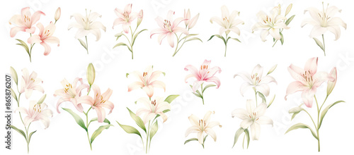 set, watercolor illustration lily flower and green leaves on transparent background. Florist bouquet. Easter lilies, International Women's Day, Mother's Day, wedding flowers.