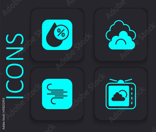 Set Weather forecast, Water drop percentage, Cloud and Wind icon. Black square button. Vector
