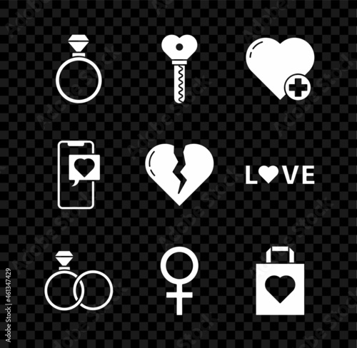 Set Wedding rings, Key heart shape, Heart, Female gender symbol, Shopping bag with, Smartphone speech bubble and Broken or divorce icon. Vector