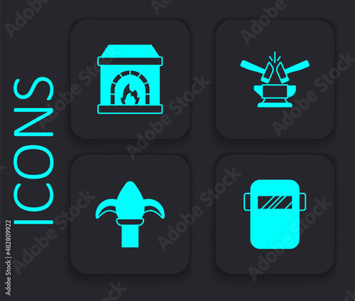 Set Welding mask, Blacksmith oven, Anvil and hammer and Classic iron fence icon. Black square button. Vector