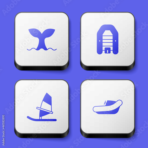 Set Whale tail, Inflatable boat with motor, Windsurfing and icon. White square button. Vector