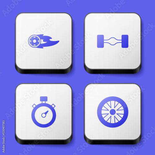 Set Wheel in fire flame, Chassis car, Stopwatch and Alloy wheel for icon. White square button. Vector