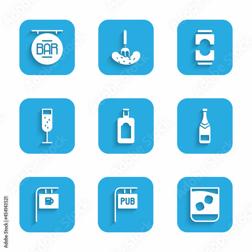 Set Whiskey bottle, Street signboard with Pub, Glass of whiskey, Champagne, Bar, champagne, Beer can and icon. Vector
