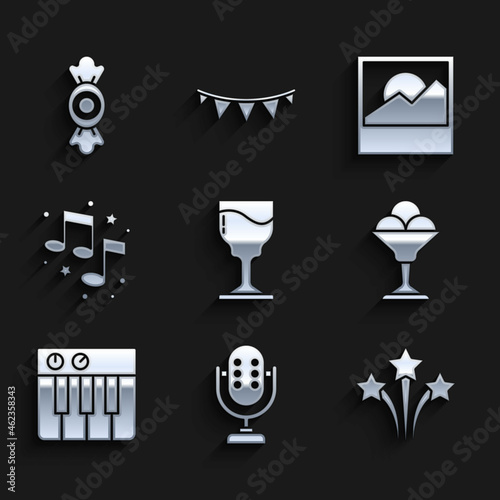 Set Wine glass, Microphone, Firework, Ice cream bowl, Music synthesizer, note, tone, Photo and Candy icon. Vector