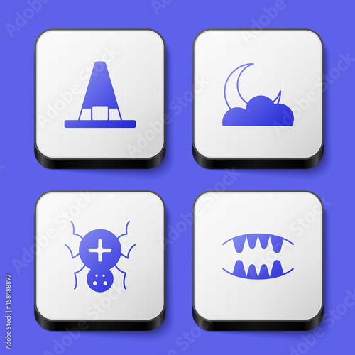Set Witch hat, Moon and stars, Spider and Vampire teeth icon. White square button. Vector