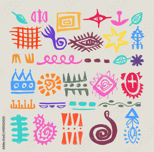 Set with african, aztec pattern colorful elements, symbols, icons, hand-drawn in doodle style. Set of abstract african tribal geometric shapes, ancient ethnic traditional symbols and ornate signs.