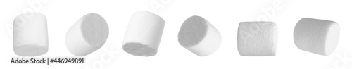 Set with delicious sweet puffy marshmallows on white background. Banner design
