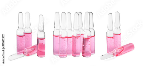 Set with glass ampoules with pharmaceutical products on white background. Banner design