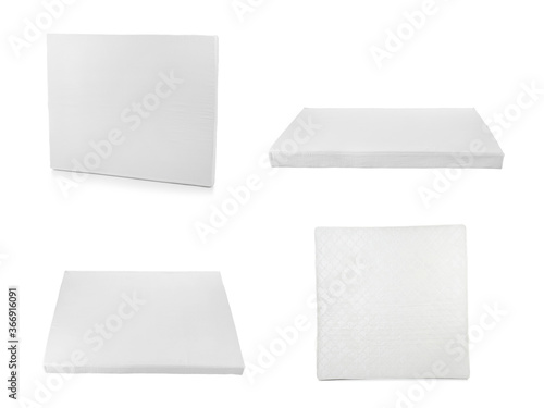 Set with modern comfortable mattresses on white background