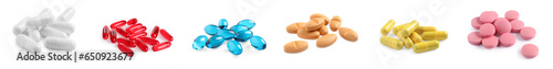 Set with piles of different pills isolated on white