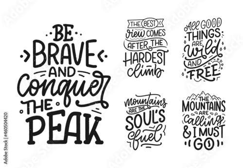 Set with quotes about mountains. Lettering slogans. Motivational phrases for print design. Vector illustration