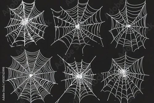 Set with spider web icons. Halloween decoration with cobweb. Spiderweb flat vector illustration. Isolated graphic. Horror, fear and creepy cartoon art concept. Net outline sketch on white background.