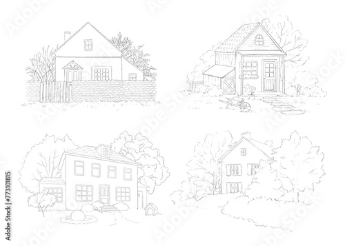 Set with summer landscape with country houses and trees isolated on white background. Graphic outline sketch illustration