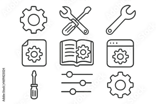 Settings icon bundle with editable thin stroke, vector tools and gear symbols set for web design, apps, user interface, development, configuration, manual, adjustment, and control