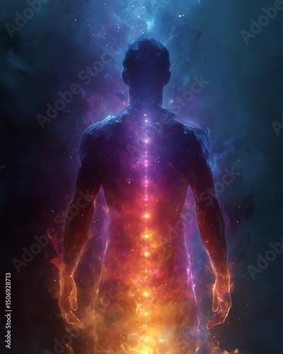 Seven chakras of the human body, Human Silhouette with Seven Chakras Glowing in Radiant Light Explosion, chakra art design, Yoga silhouette