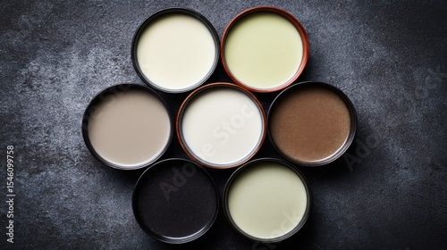 Seven round bowls arranged in a circular pattern on a dark, textured gray surface, each containing unique liquids: white, pale yellowish-green, brown, creamy white, light beige,