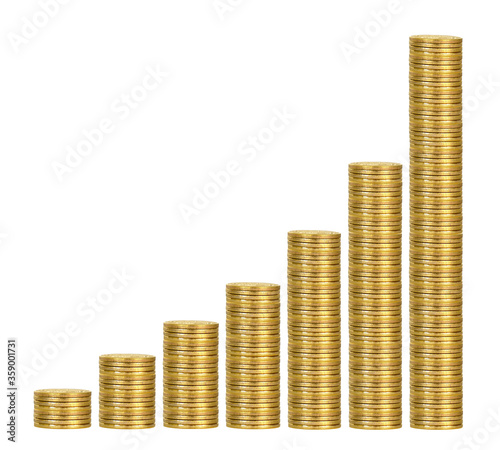 Seven stacks of golden coins arranged in growing direction, isolated on white background