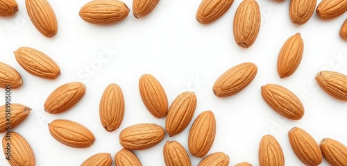 Several almonds viewed from directly above, isolated on a pure white background, vegan, photography