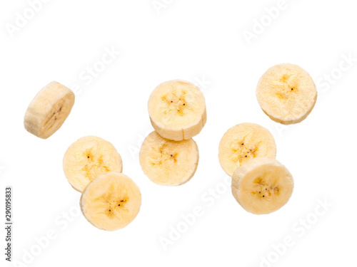 Several banana slices, isolated on white background with clipping path. Peeled falling slices of banana, group of pairs of two slices of banana
