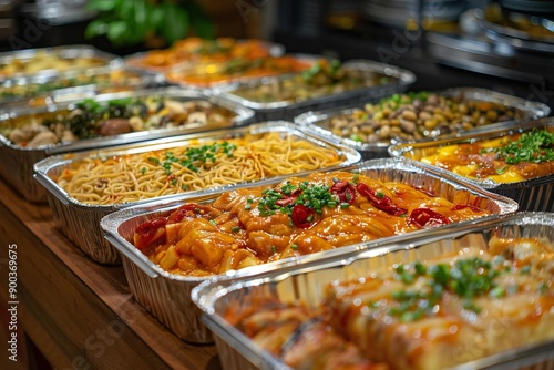 Several beautiful individuals preparing different types of tasty meals in foil containers on the table.