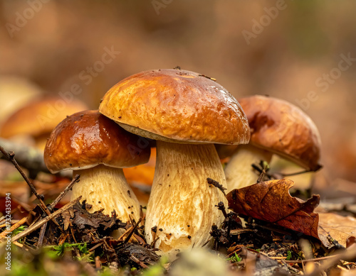 Several Brown Capped Mushrooms on Leaf Strewn Forest Floor