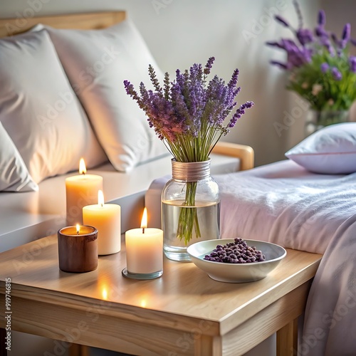Several burning candles with flower on bedside table in light cozy bedroom interior. Selective focus. With space for text.