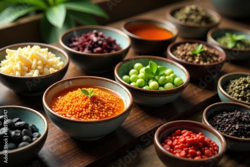 Several ceramic bowls filled with diverse types of tea, mix, organic