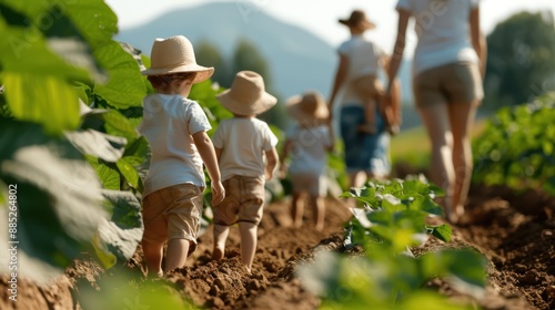 Several children and adults walk together through a farm, surrounded by crops and wearing hats, highlighting community, agricultural activities, and a shared journey in nature.
