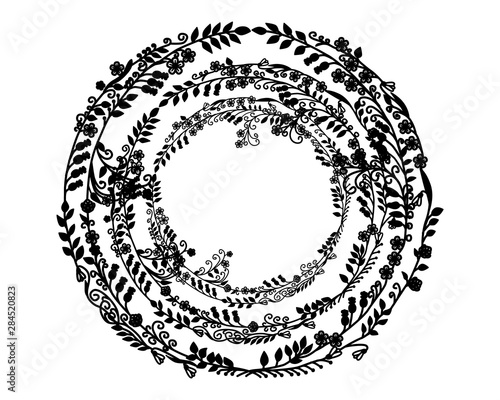 Several circles with a beautiful ornament. Stencil of wreaths from the branches of leaves and flowers