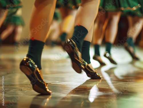 Several dancers perform a traditional Irish dance in honor of St. Patrick's Day. The emphasis is on the dancers' feet
