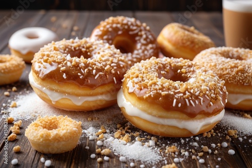 several donuts with icing and sprinkles on a wooden table