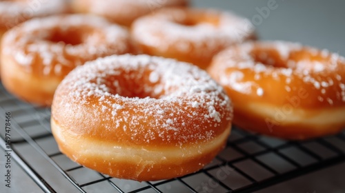 Several donuts with powdered sugar on a wire rack, close-up of delicious powdered sugar donuts.