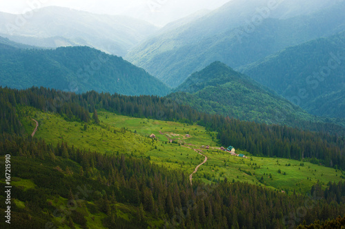 Several huts on a green meadow near a winding road in the valley among majestic green rugged hills covered in lush grass and pine forest. Summer day in June. Marmarosh, Carpathian mountains, Ukraine