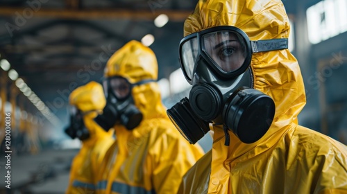 Several individuals wearing yellow protective suits and gas masks participate in safety training within an industrial space characterized by high ceilings and equipment.