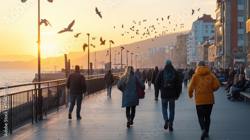 Several people walking along a seaside promenade during sunset, with birds flying overhead and buildings lining the street.