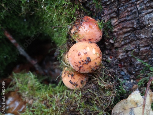 Several poisonous mushrooms grow on an old tree stump in the moss. The topic of poisonous mushrooms in the forest. Mushroom picking and outdoor recreation.