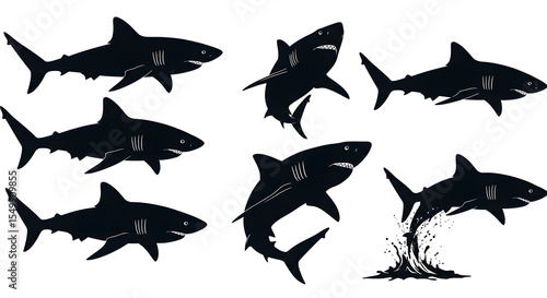 Several shark silhouettes are displayed, some swimming, one leaping from the water.